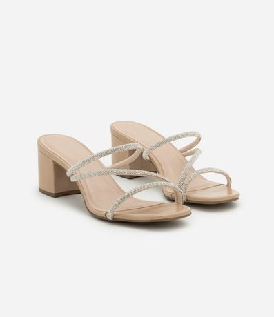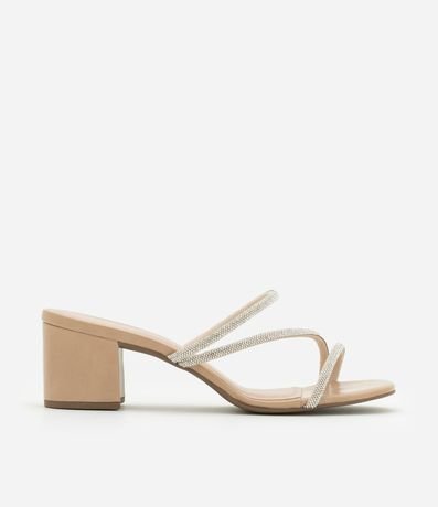 Ref: Sandália feminina confeccionada em pu com salto médio bloco, bico redondo e tiras finas com brilho.