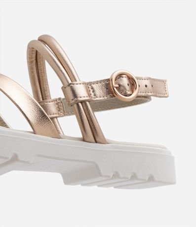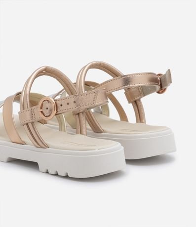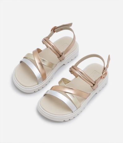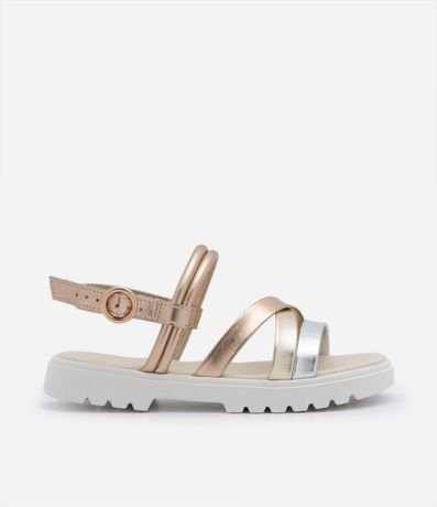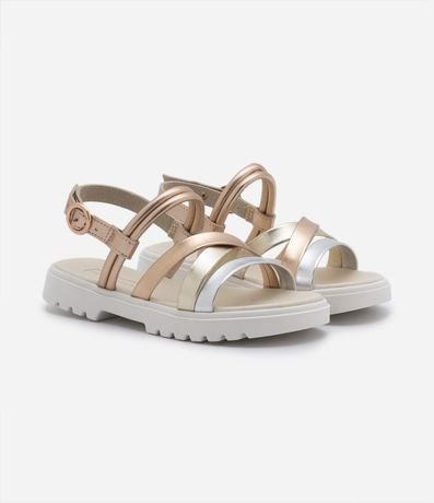 Sandália infantil com tiras cruzadas metalizadas, fechamento por fivela e solado contrastante tratorado.
