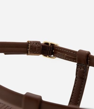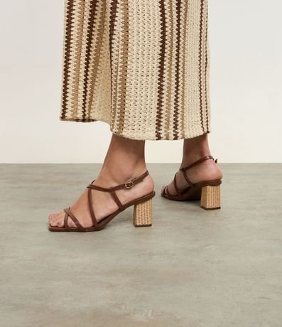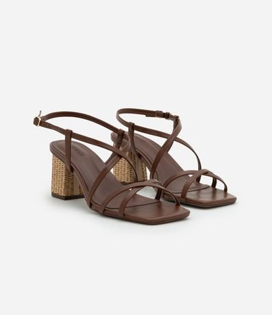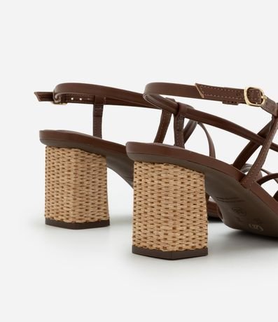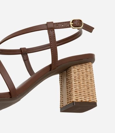 Ref: Sandália de bico redonda, confeccionada em PU, com fivela e tiras. Possui salto alto de 7,5 centímetros com aspecto de ráfia.