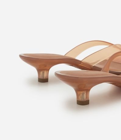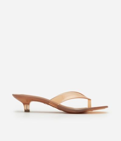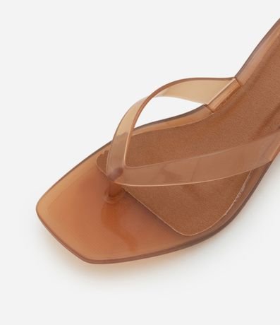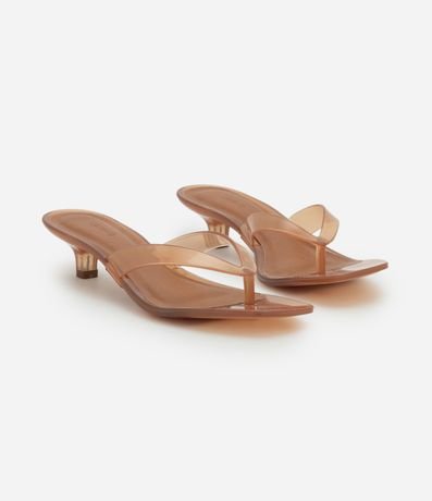 Par de sandálias femininas confeccionadas em material sintético. O calçado tem uma tira superior que lembra um chinelo, salto médio, bico quadrado e superfície lisa sem estampa.