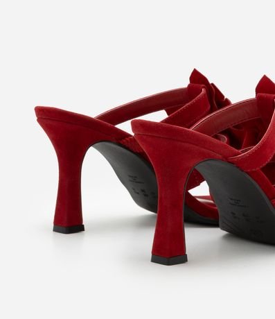 Sandália mule de PU, com efeito camurça, com salto médio de 07 centímetros e bico quadrado. Peça com flor aplicada de PU.