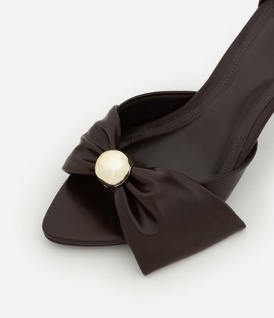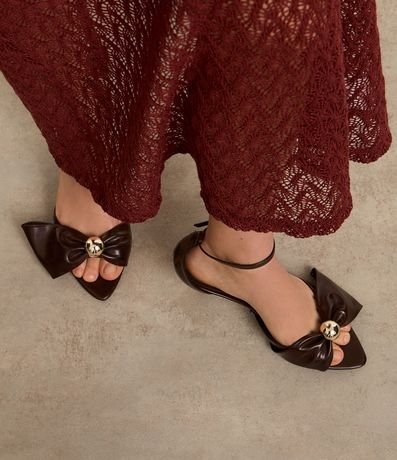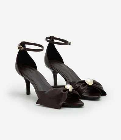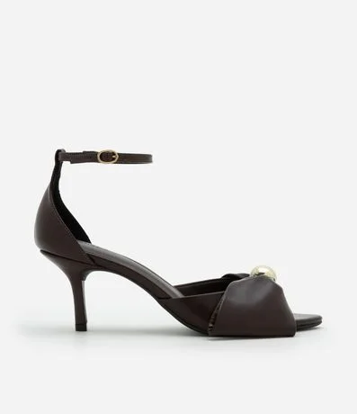 Ref: Sandália feminina confeccionada em material sintético com bico fino com laço e aplicação de esfera dourada. Peça com salto fino, tira fina com fivela lateral.