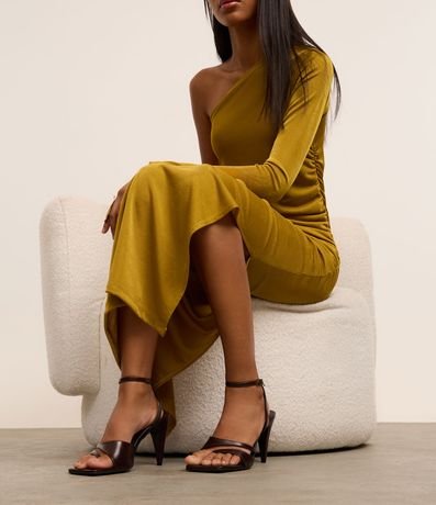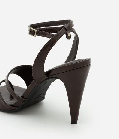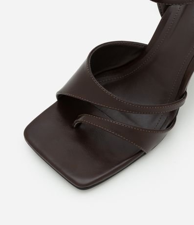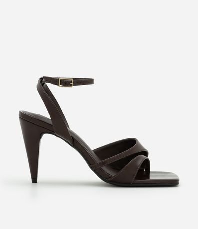 Ref: Sandália feminina com bico quadrado, tiras assimétricas, tira fina com fivela lateral e salto alto.