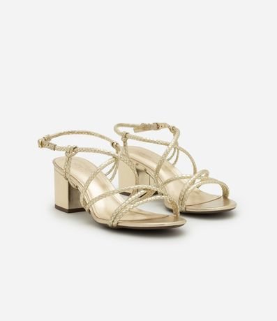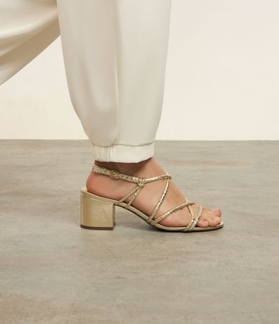 Ref: Sandália feminina com bico redondo, tiras cruzadas com textura de cobra, fivela lateral, salto bloco.