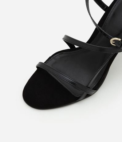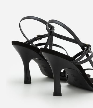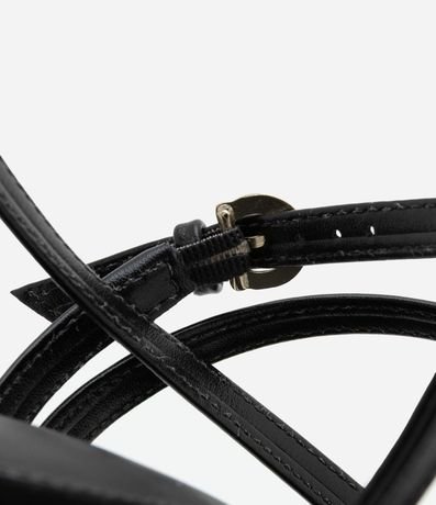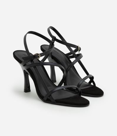 Ref: Sandália feminina confeccionada em material sintética com bico redondo, tiras finas assimétricas com fivela lateral e salto alto diferenciado.