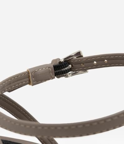 Sandália feminina, confeccionada em PU, com detalhe de pelinho fake na tira frontal, fechamento por fivela no tornozelo e salto fino diferenciado.