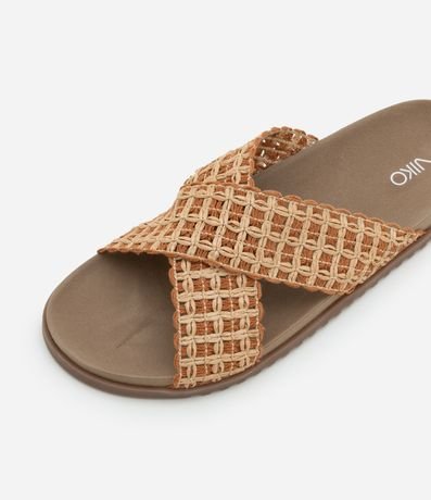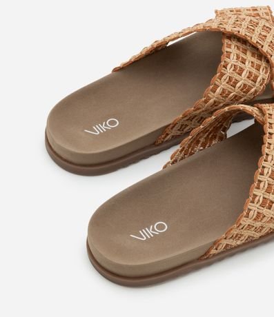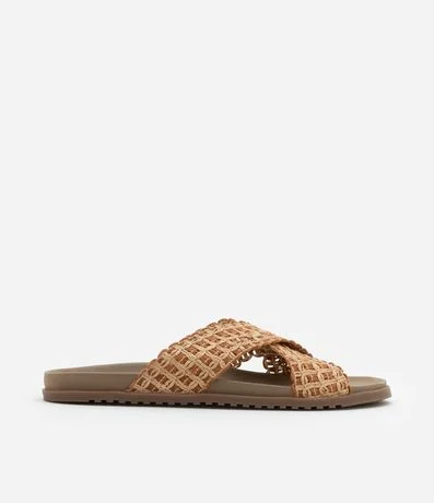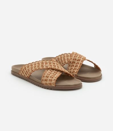 Sandália masculina confeccionada em material sintético com tiras largas sobrepostas em tressê.