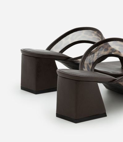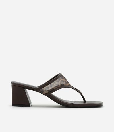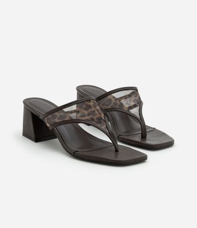 Sandália de dedinho feminina, confeccionada em PU, com tela estampa animal print oncinha e salto médio quadrado, medindo 6cm.