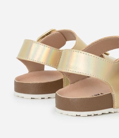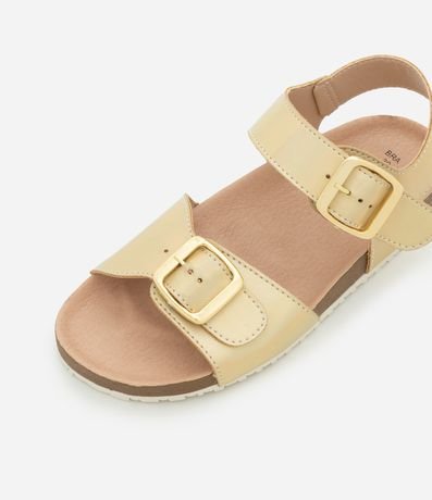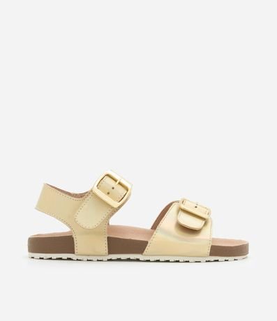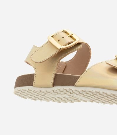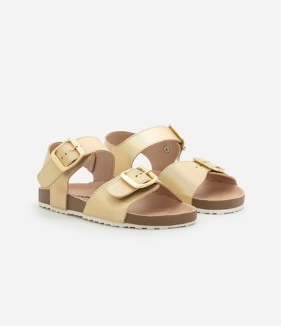 Sandália infantil confeccionada em PU com acabamento dourado. Modelo com duas tiras e fivelas ajustáveis, palmilha confortável e solado antiderrapante, garantindo estilo, praticidade e conforto para os dias quentes.