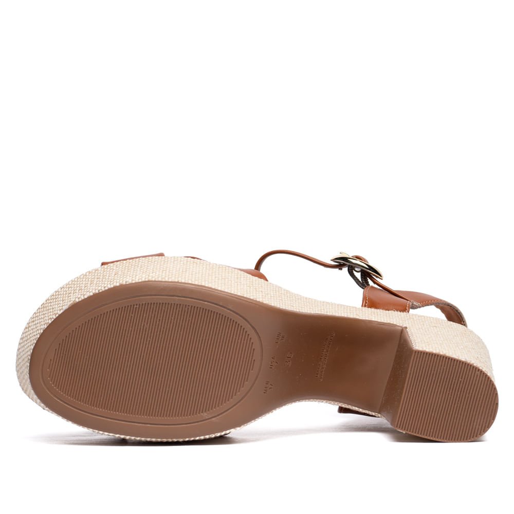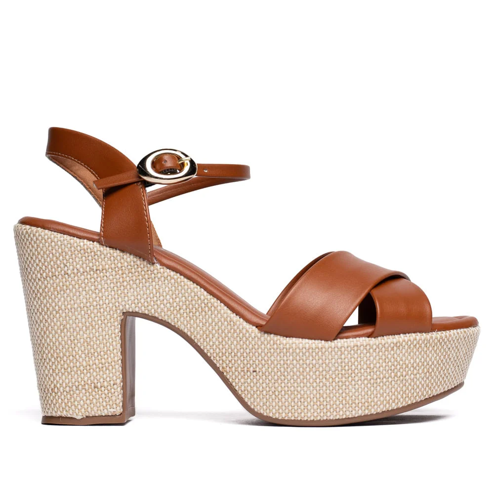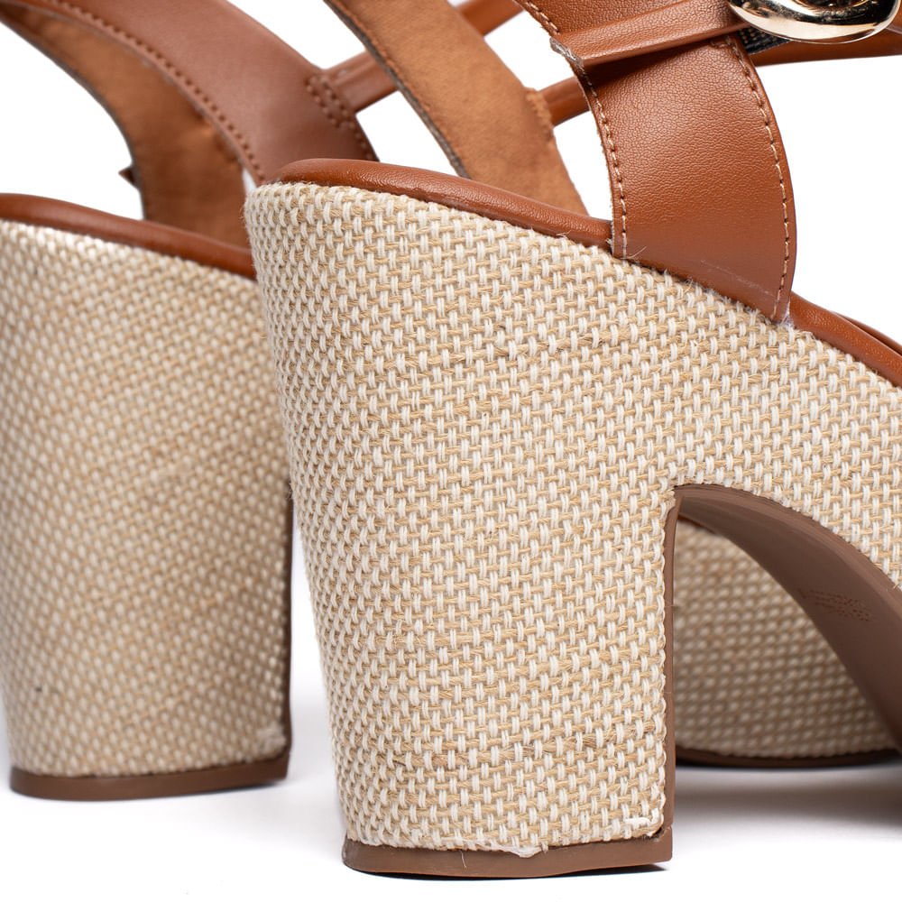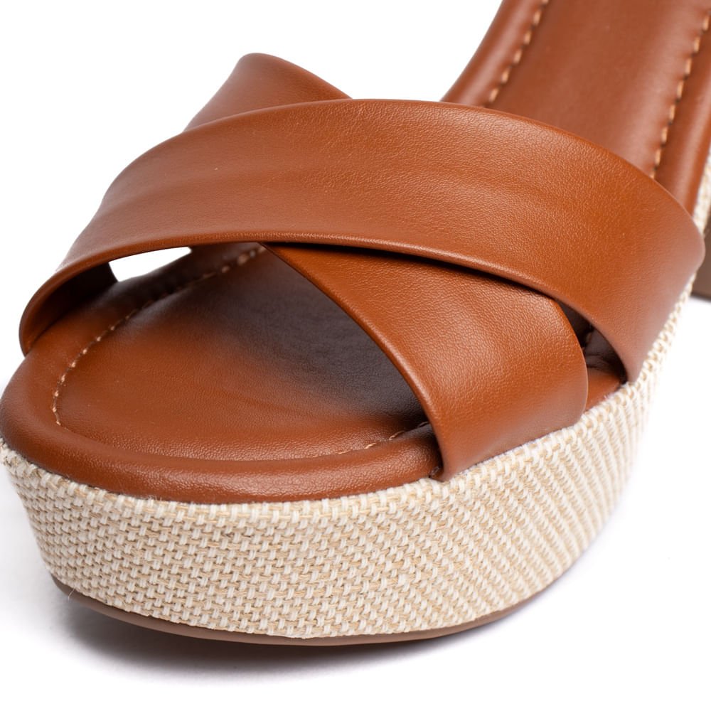 Diferencial: possui tiras largas cruzadas na parte frontal, salto forrado com material tramado