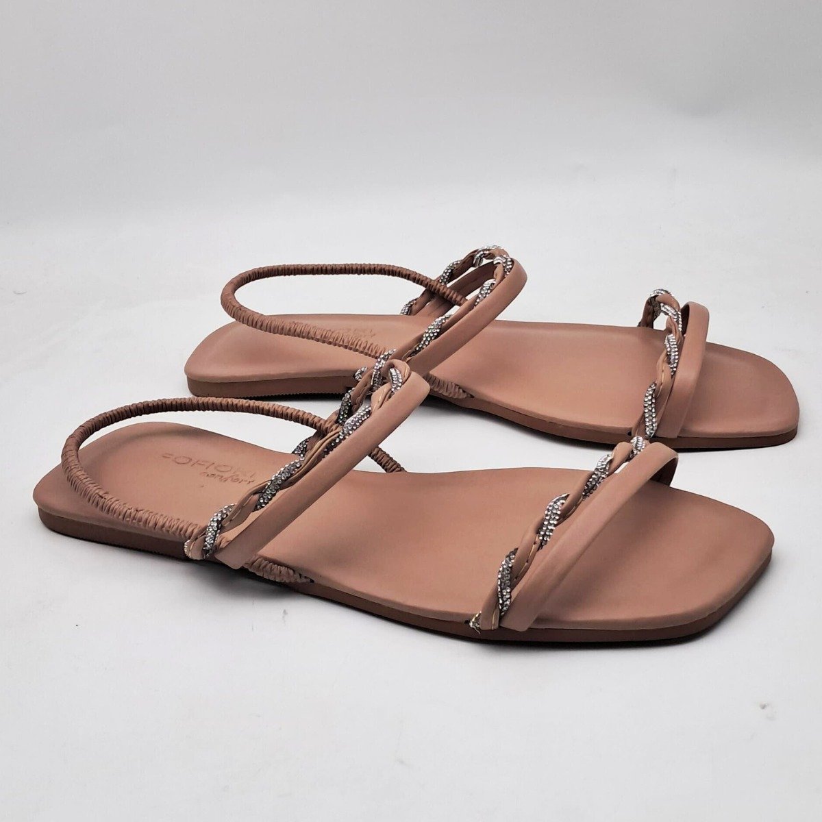 Diferenciais: Tiras com brilho, design trançado e solado antiderrapante