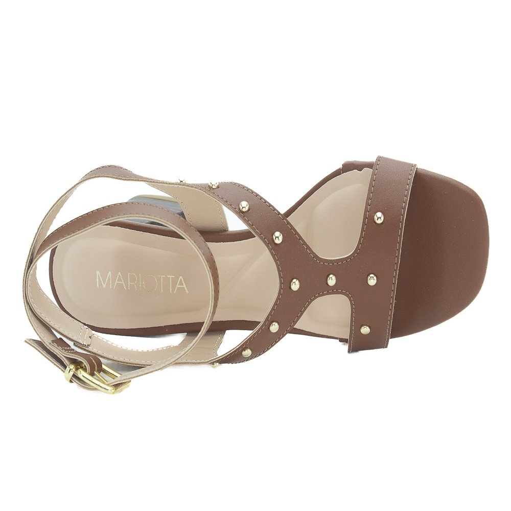 Ref: A Sandália Mariotta em camurça Macau na cor marrom é perfeita para quem busca unir charme, conforto e estilo boho chic. O modelo conta com salto bloco médio de 6 cm revestido com material que remete à madeira, conferindo sofisticação rústica ao visual. Seu cabedal estruturado valoriza o peito do pé, enquanto as pequenas tachas aplicadas adicionam um toque artesanal e moderno, ideal para composições casuais e cheias de estilo.