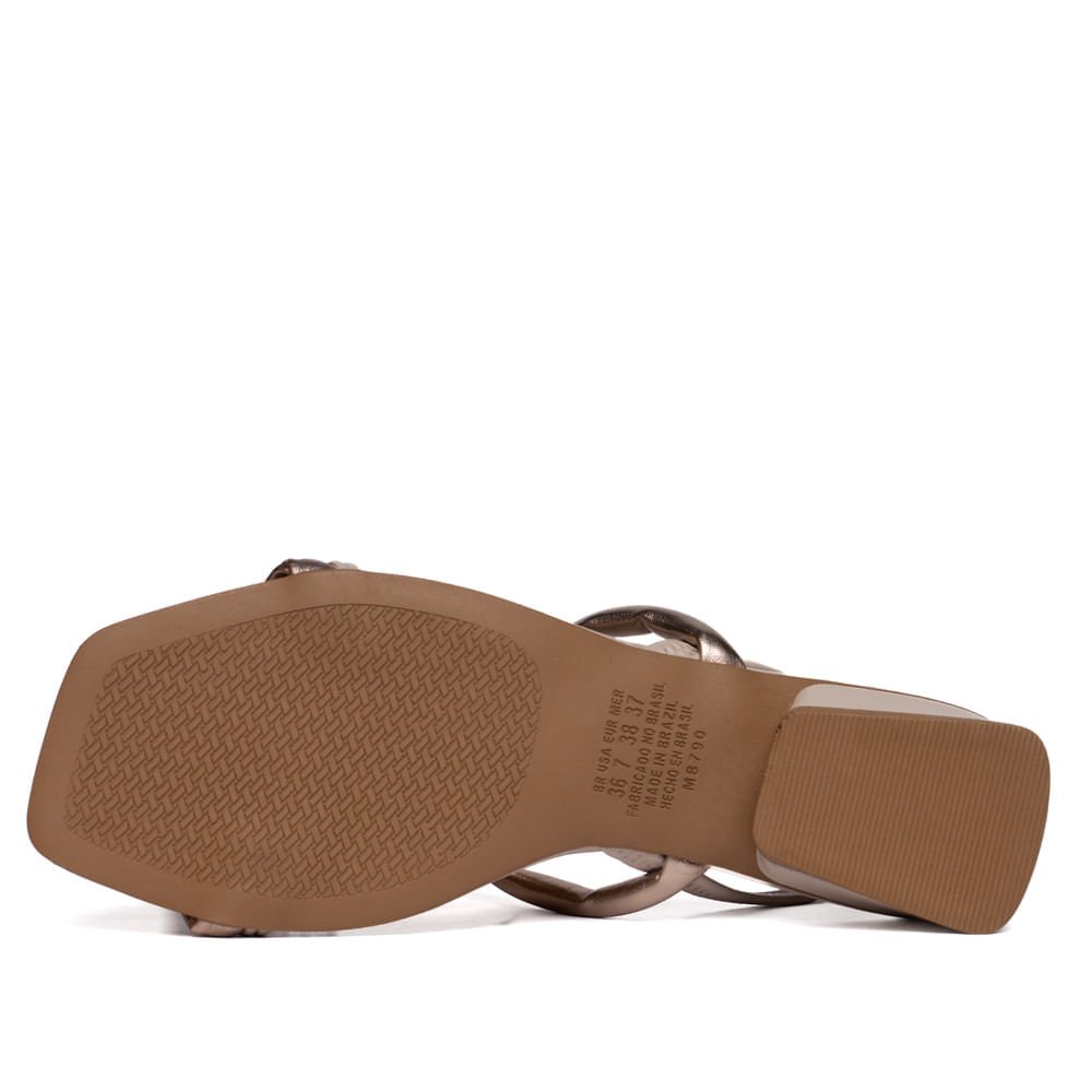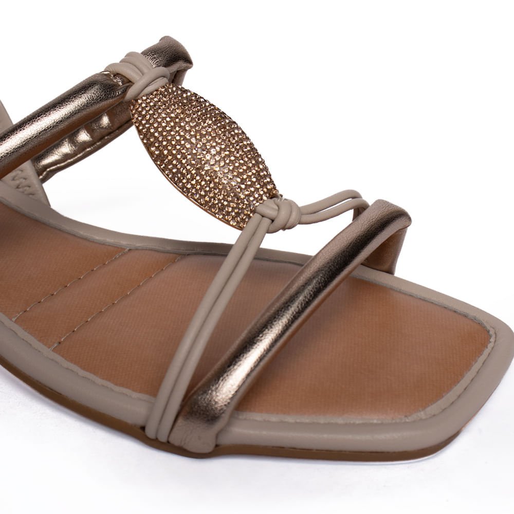 Ref: O salto bloco baixo de 3,5 cm garante estabilidade, enquanto o bico de contorno quadrado confere sofisticação. As tiras finas e macias, combinadas com o detalhe em strass no cabedal, oferecem charme extra ao visual e se ajustam com suavidade aos pés. Seu calce fácil, com tira maleável que envolve o calcanhar, proporciona praticidade para o dia a dia. Além disso, a leveza do material em napa sintética torna a sandália confortável e resistente para diferentes ocasiões.