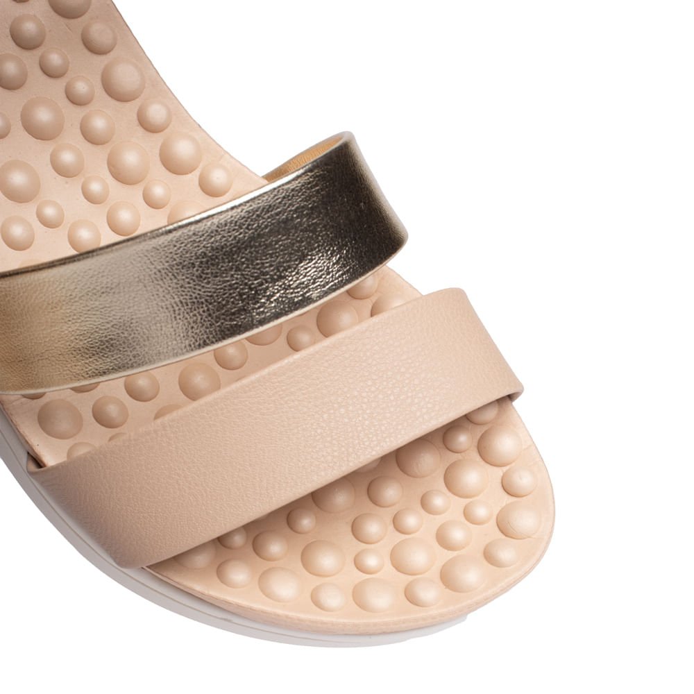 Confeccionada em materiais de alta qualidade, a sandália Modare apresenta cabedal com duas tiras frontais, uma com textura tramada e outra metalizada, além de uma tira elástica que proporciona durabilidade e conforto ao longo do dia.