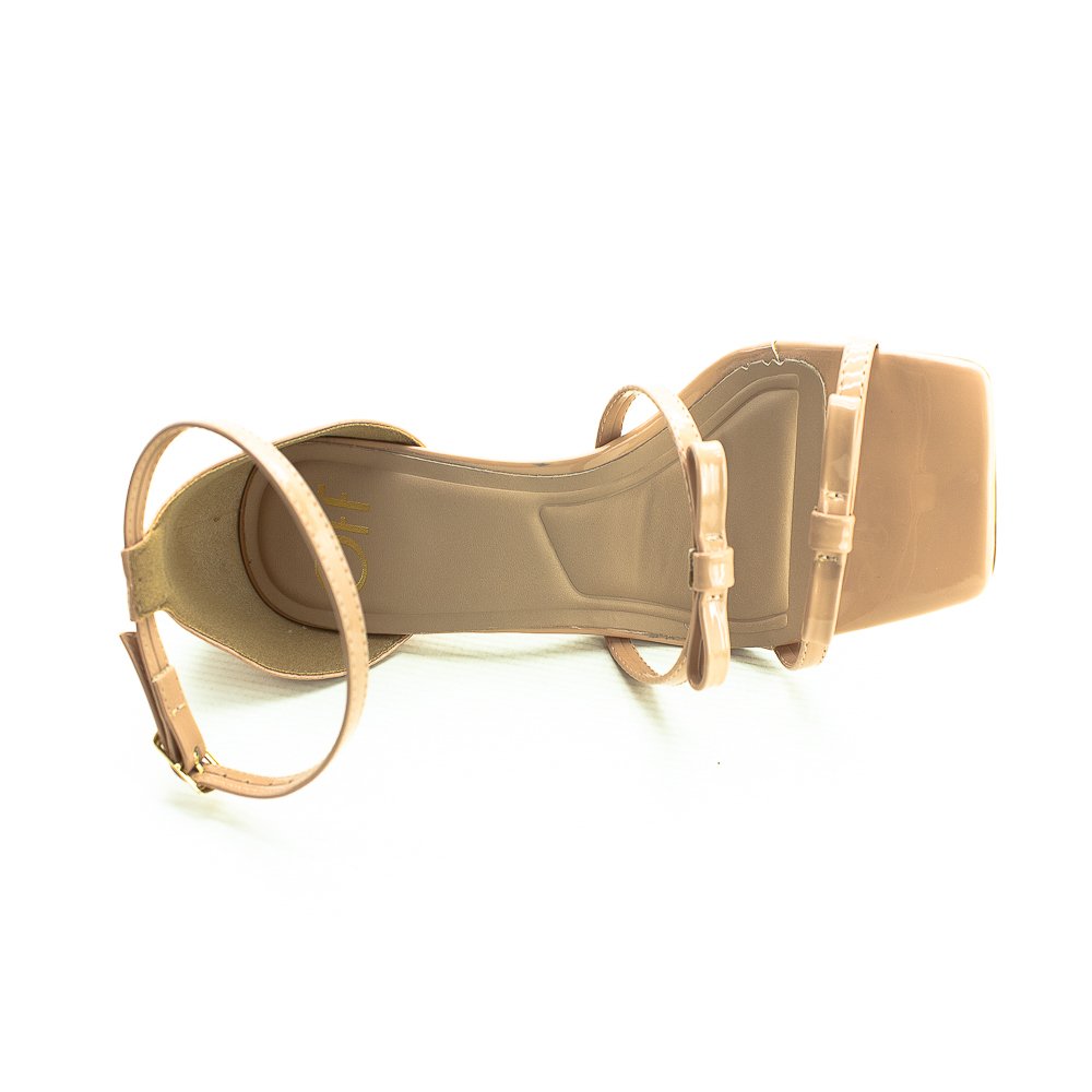 Sandália de salto fino medindo 6,5 cm de altura. Possui tiras finas com laço delicado feitas em material sintético, calcanhar fechado e tornozeleira com fivela para ajuste. Solado em borracha.
