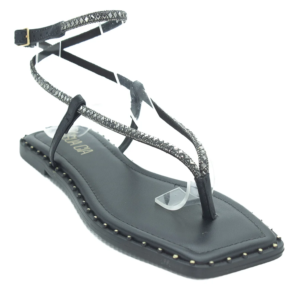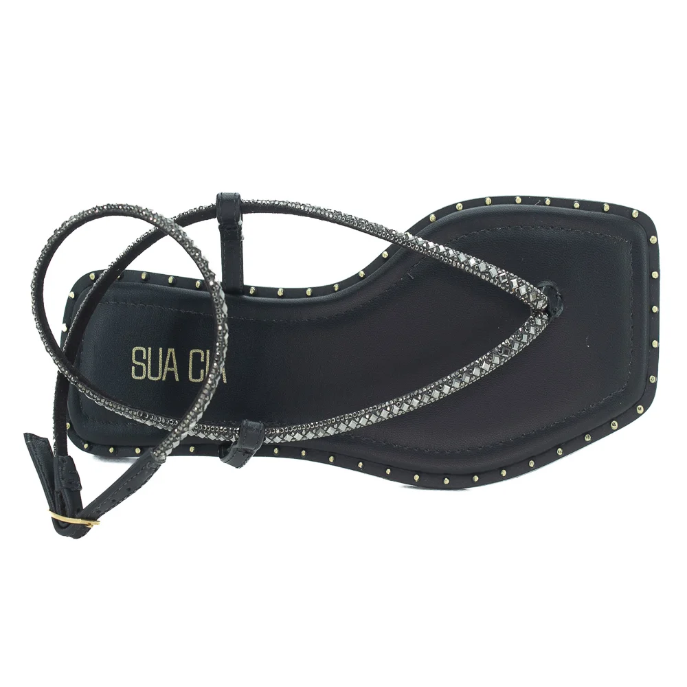 Sandália Sua Cia Rasteira 8394.16121 A Sandália Sua Cia une delicadeza e modernidade em um design versátil e sofisticado. O modelo apresenta tiras finas em tom preto, bordadas com pedrarias escuras que trazem brilho discreto e elegante, perfeito para valorizar diferentes produções. O solado possui contorno com aplicação de tachas metálicas, adicionando personalidade e um toque de estilo ao calçado.Com bico quadrado, reforça a modernidade do design, enquanto a palmilha macia garante conforto em cada passo. Atemporal e estilosa, é a escolha ideal para compor looks casuais ou mais elaborados, acompanhando desde o dia a dia até ocasiões especiais com muito charme.