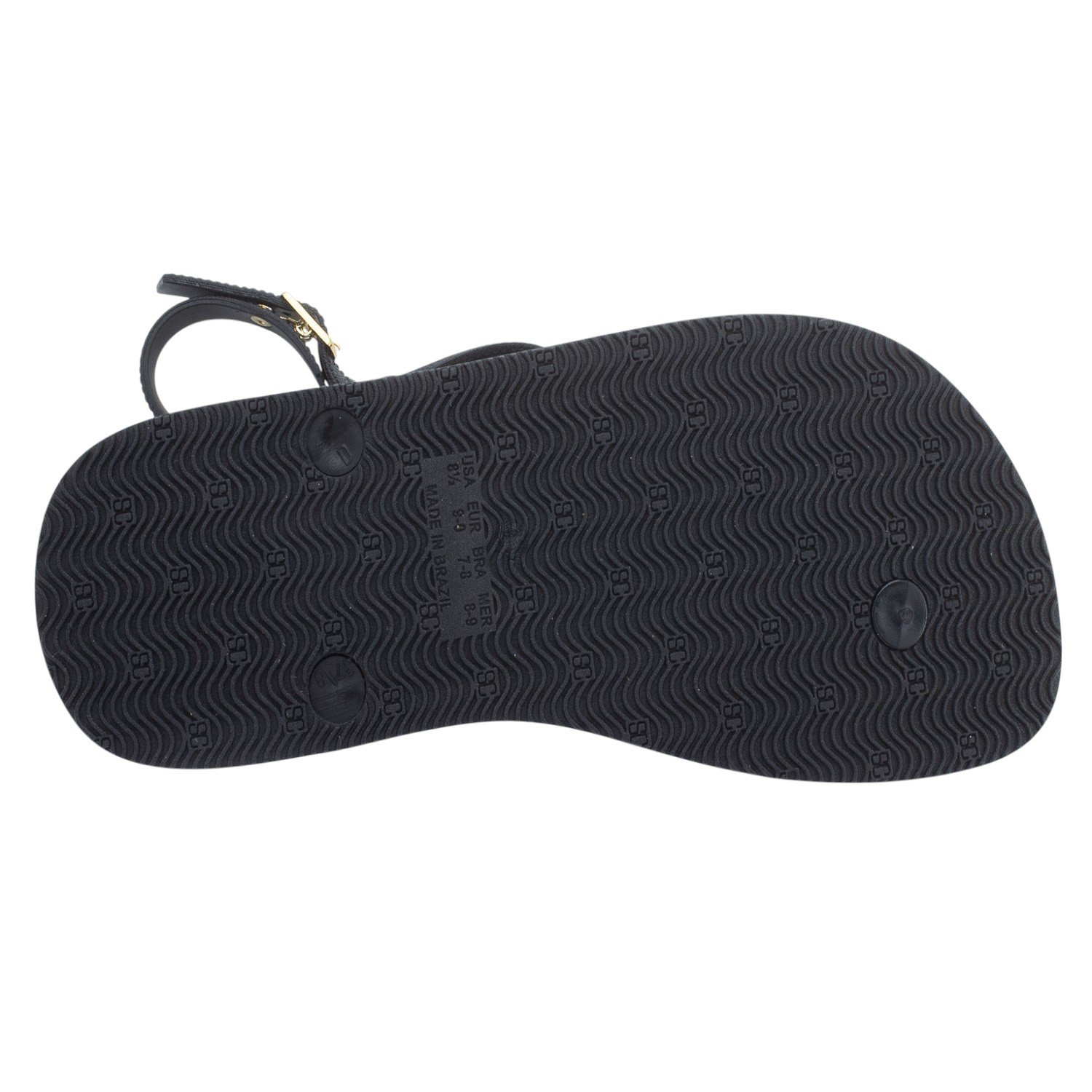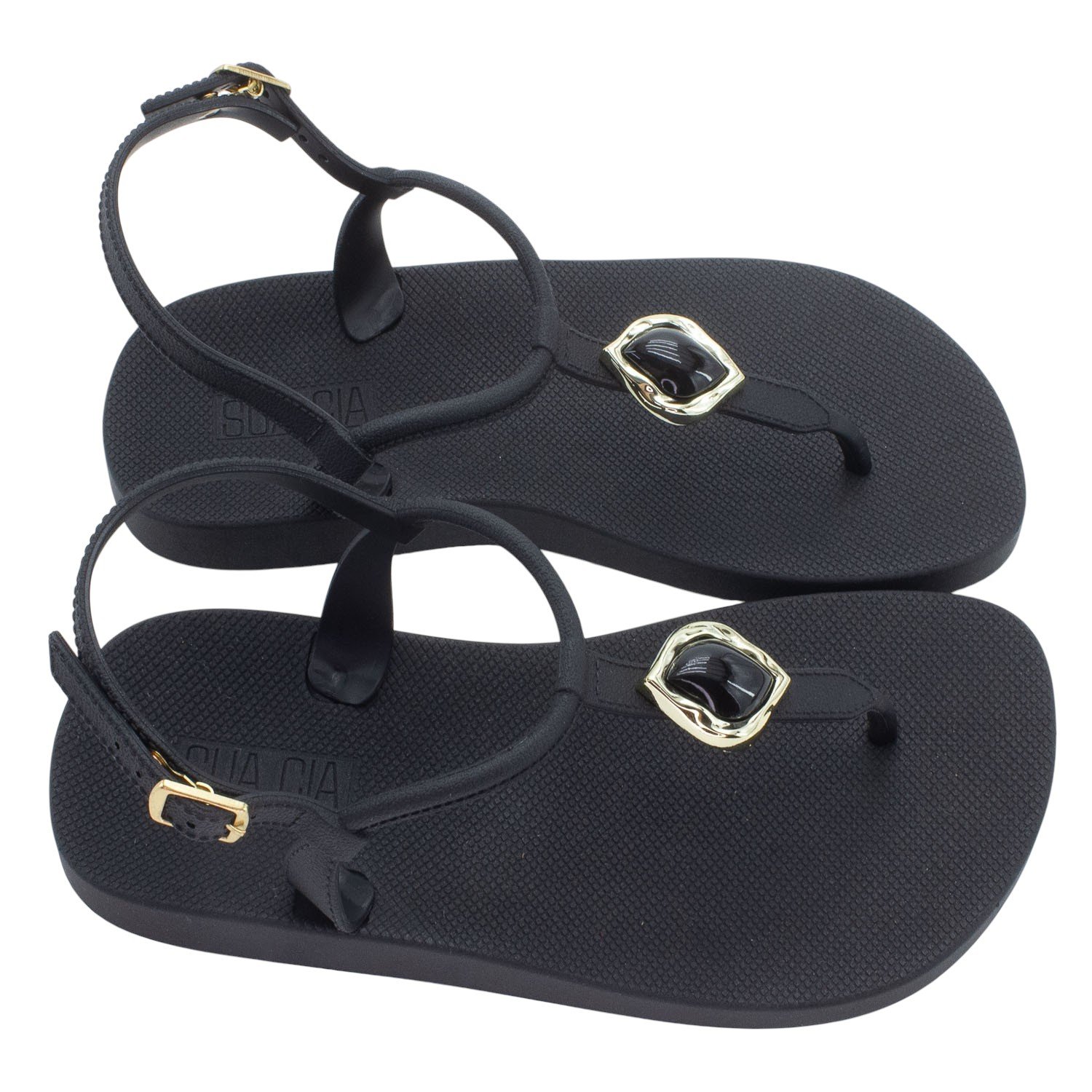 Esta é a Sandália Feminina Sua Cia, referência 8515.17030, agora apresentada na elegante cor Preta. O modelo combina praticidade e sofisticação, sendo uma escolha versátil para o dia a dia e diversas ocasiões que pedem conforto com um toque de estilo. A sandália possui um design flat (rasteira) com tira de dedo e uma alça traseira ajustável no estilo slingback, garantindo um calce seguro e personalizado. O grande destaque fica por conta do enfeite central, posicionado sobre a tira no peito do pé: trata-se de um aplique em formato orgânico na cor preta brilhante, emoldurado por um detalhe metalizado dourado que cria um contraste chique e confere um toque de luxo sutil ao calçado. O fechamento é feito por uma fivela lateral dourada, também ajustável. Construída em material sintético de alta qualidade, a sandália é notavelmente leve e confortável, ideal para longos períodos de uso. Sua sola plana apresenta uma textura antiderrapante padronizada com o logo da marca, promovendo maior segurança e aderência ao caminhar. A combinação de seu design minimalista com o detalhe elegante torna-a uma peça essencial para compor visuais variados, desde os mais casuais até os um pouco mais elaborados.