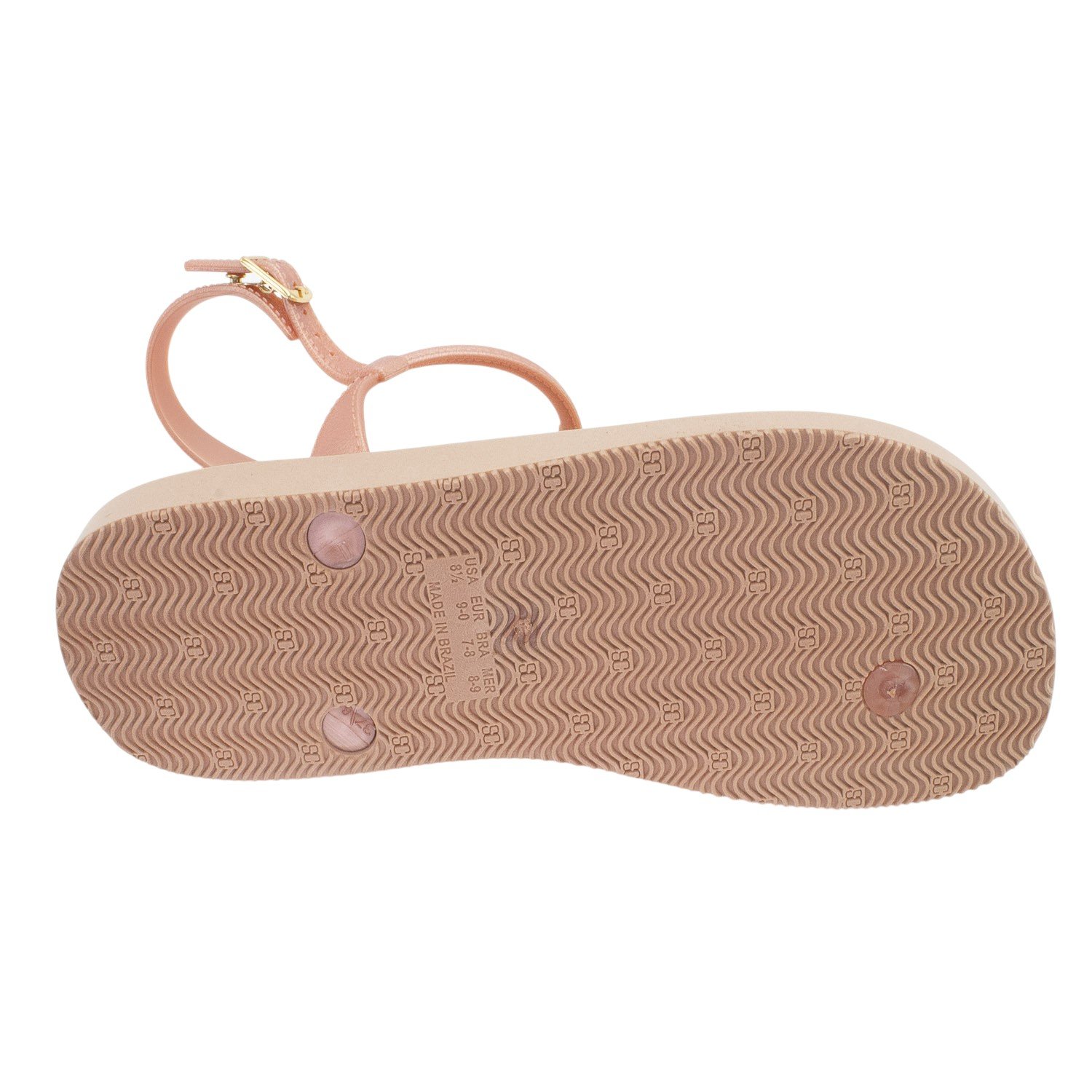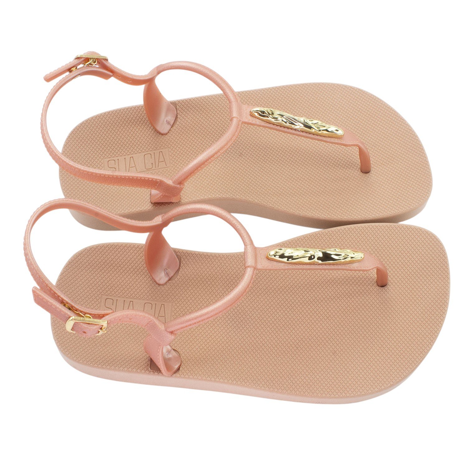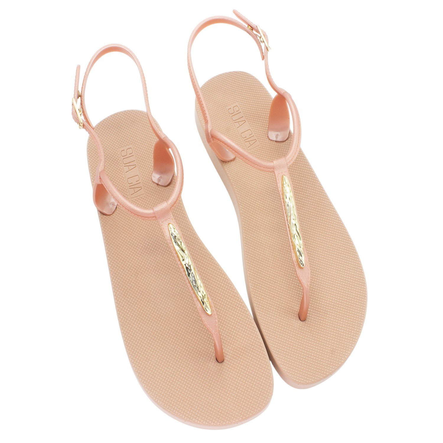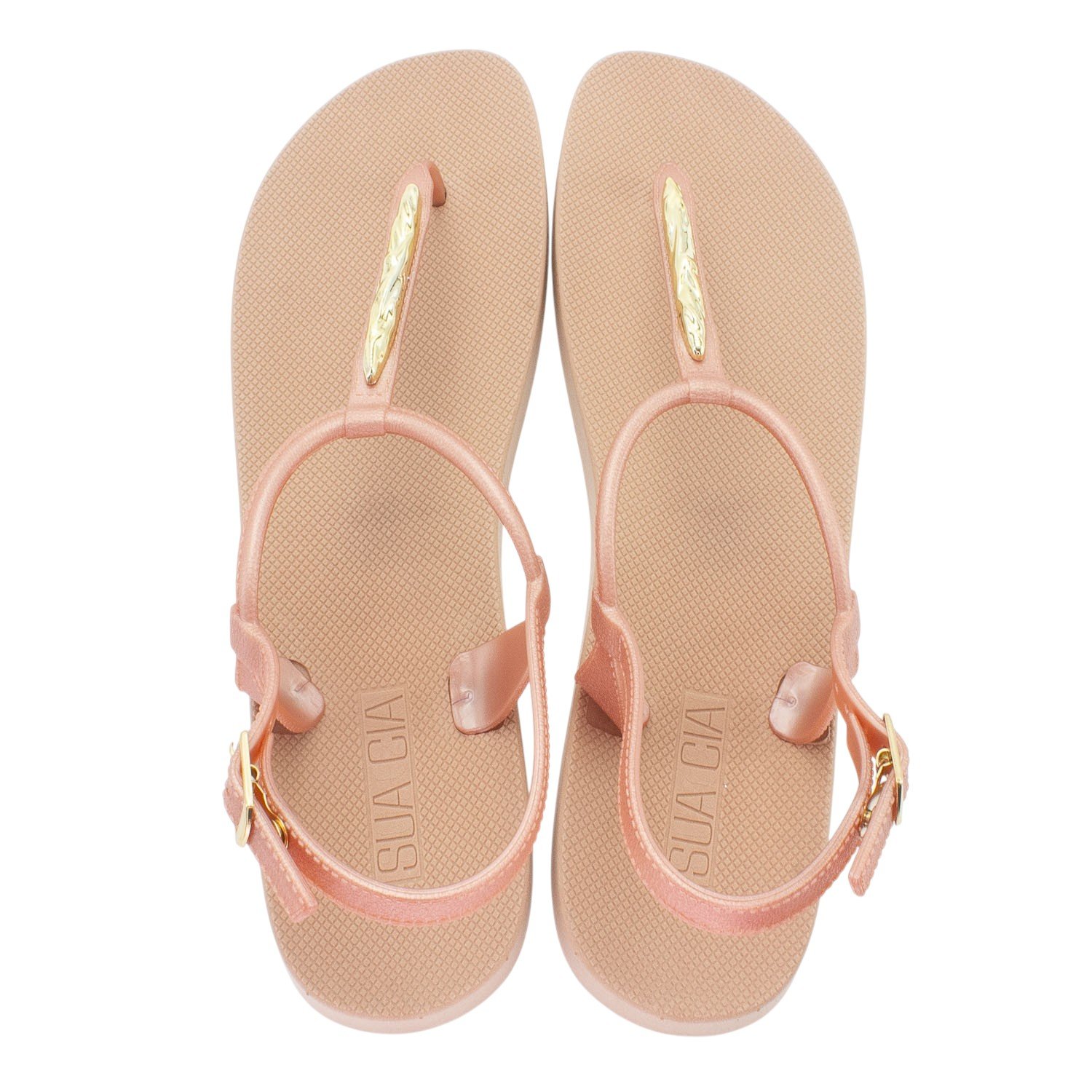 A Sandália Feminina Sua Cia, modelo 8515.17031, une praticidade e elegância em um design moderno e versátil. Sua cor Nude a torna uma peça essencial e fácil de combinar com diversos looks casuais, ideal para o uso diário em climas quentes. Confeccionada em material sintético, ela oferece durabilidade e facilidade de manutenção. O modelo combina a estrutura de uma sandália de dedo, com uma tira central que passa pelo dedão, e uma tira traseira de segurança. O grande destaque é o aplique metalizado orgânico na cor dourada, posicionado sobre a tira central no peito do pé, que adiciona um toque sofisticado e feminino ao calçado. O solado é rasteiro (flat), proporcionando o conforto necessário para longas horas de uso, e possui uma textura antiderrapante com o logo "SC" em relevo para auxiliar na aderência. A segurança ao caminhar é garantida pela tira do calcanhar, que possui ajuste por meio de uma fivela dourada delicada, permitindo o encaixe perfeito no pé.
