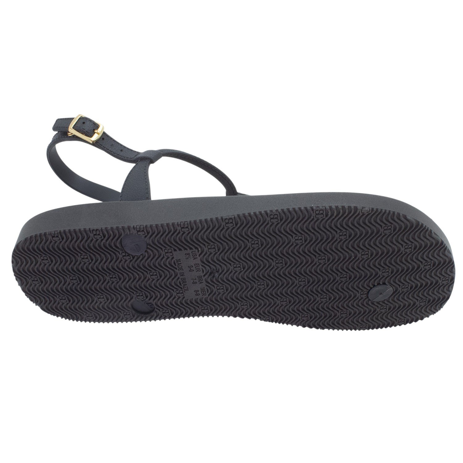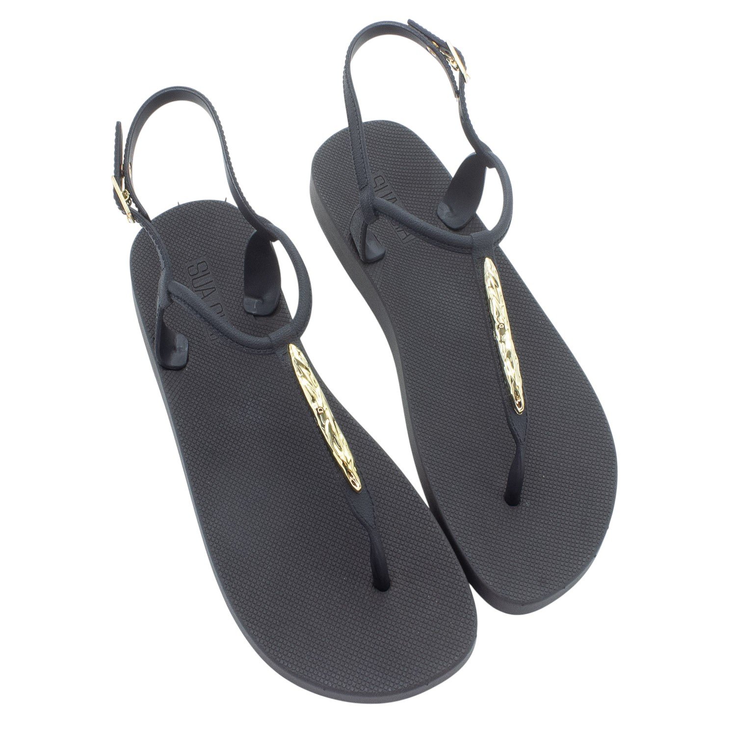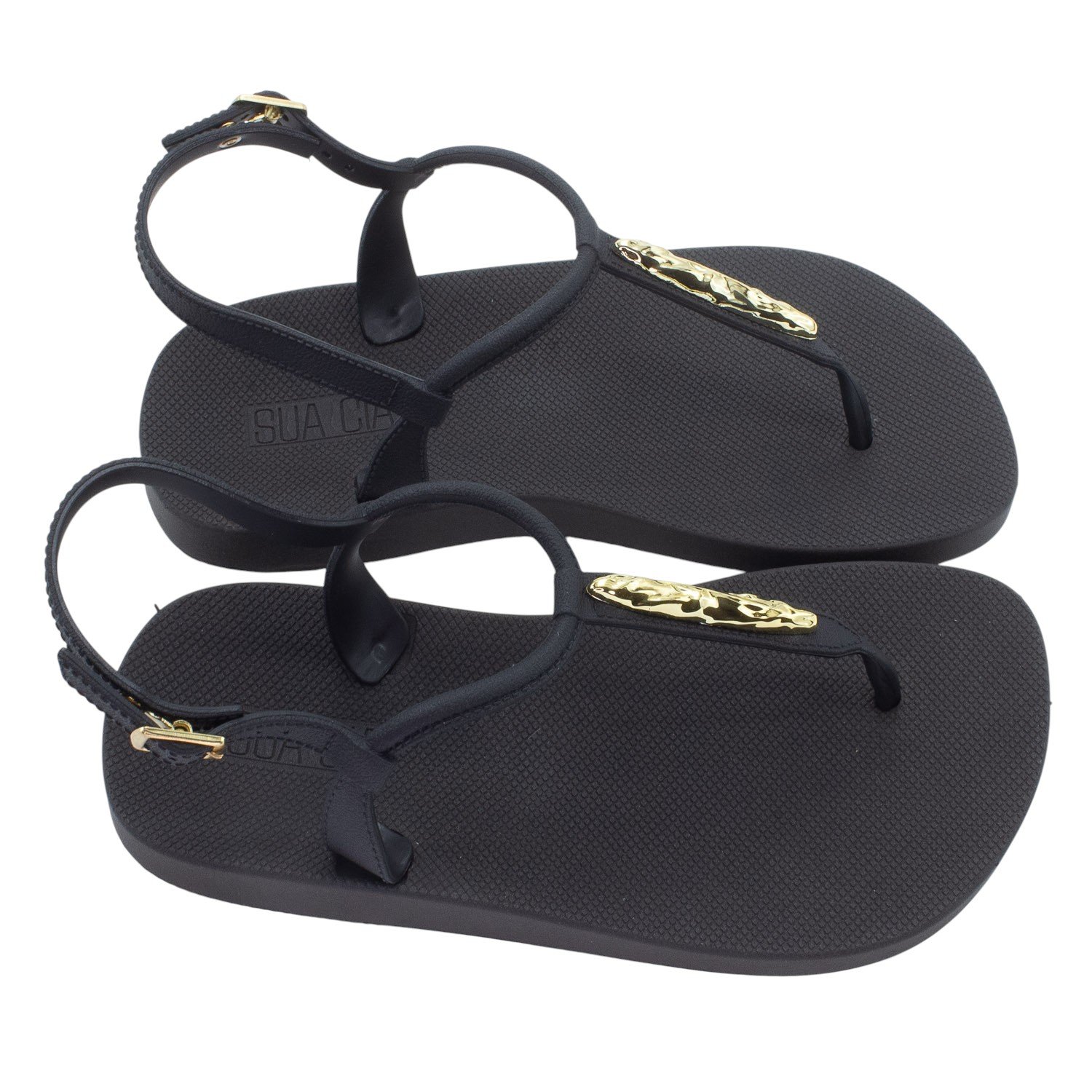 A Sandália Feminina Sua Cia, modelo 8515.17031, é uma rasteira que une praticidade e elegância em um design moderno e versátil. Sua cor Preto a torna uma peça essencial e fácil de combinar com diversos looks casuais, ideal para o uso diário em climas quentes. Confeccionada em material sintético, ela oferece durabilidade e facilidade de manutenção. O modelo combina a estrutura de uma sandália de dedo, com uma tira central que passa pelo dedão, e uma tira traseira de segurança. O grande destaque é o aplique metalizado orgânico na cor dourada, posicionado sobre a tira central no peito do pé, que adiciona um toque sofisticado e feminino ao calçado, contrastando elegantemente com o preto da sandália. O solado é rasteiro (flat), proporcionando o conforto necessário para longas horas de uso, e possui uma textura antiderrapante com o logo "SC" em relevo para auxiliar na aderência. A segurança ao caminhar é garantida pela tira do calcanhar, que possui ajuste por meio de uma fivela dourada delicada, permitindo o encaixe perfeito no pé.