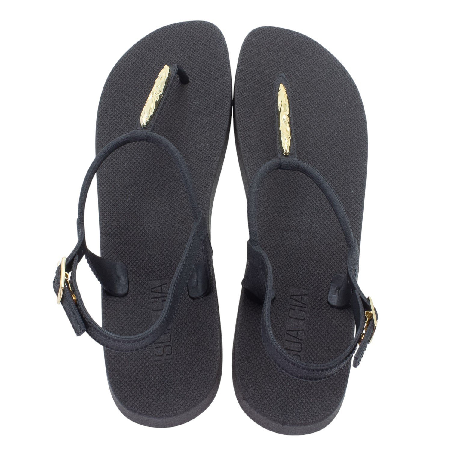 A Sandália Feminina Sua Cia, modelo 8515.17031, é uma rasteira que une praticidade e elegância em um design moderno e versátil. Sua cor Preto a torna uma peça essencial e fácil de combinar com diversos looks casuais, ideal para o uso diário em climas quentes. Confeccionada em material sintético, ela oferece durabilidade e facilidade de manutenção. O modelo combina a estrutura de uma sandália de dedo, com uma tira central que passa pelo dedão, e uma tira traseira de segurança. O grande destaque é o aplique metalizado orgânico na cor dourada, posicionado sobre a tira central no peito do pé, que adiciona um toque sofisticado e feminino ao calçado, contrastando elegantemente com o preto da sandália. O solado é rasteiro (flat), proporcionando o conforto necessário para longas horas de uso, e possui uma textura antiderrapante com o logo "SC" em relevo para auxiliar na aderência. A segurança ao caminhar é garantida pela tira do calcanhar, que possui ajuste por meio de uma fivela dourada delicada, permitindo o encaixe perfeito no pé.