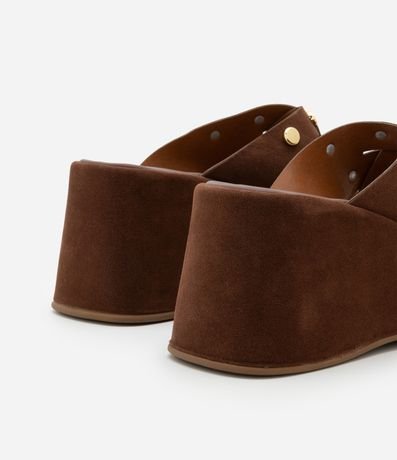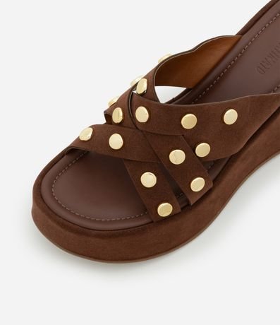 Ref: Sandália feminina confeccionada em pu, peça no modelo flatform com salto plataforma, tiras largas transpassadas e aplicação de tachinhas, com efeito camurça.