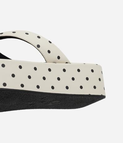 Ref: Sandália flatform feminina em PU com estampa de poá. Possui tiras largas no formato de dedo. Peça divertida para combinar com diversos looks.