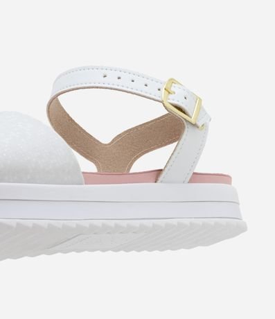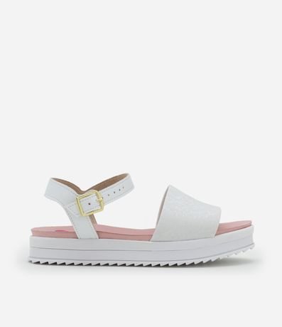 Ref: Sandália infantil modelo flatform, com bico redondo, tiras larga brilhante, tira no calcanhar e fechamento por fivela.