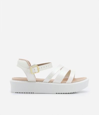 Sandália infantil modelo flatform, com bico redondo, tiras com efeito holográficas, tira comfort no calcanhar e fechamento por fivela.
