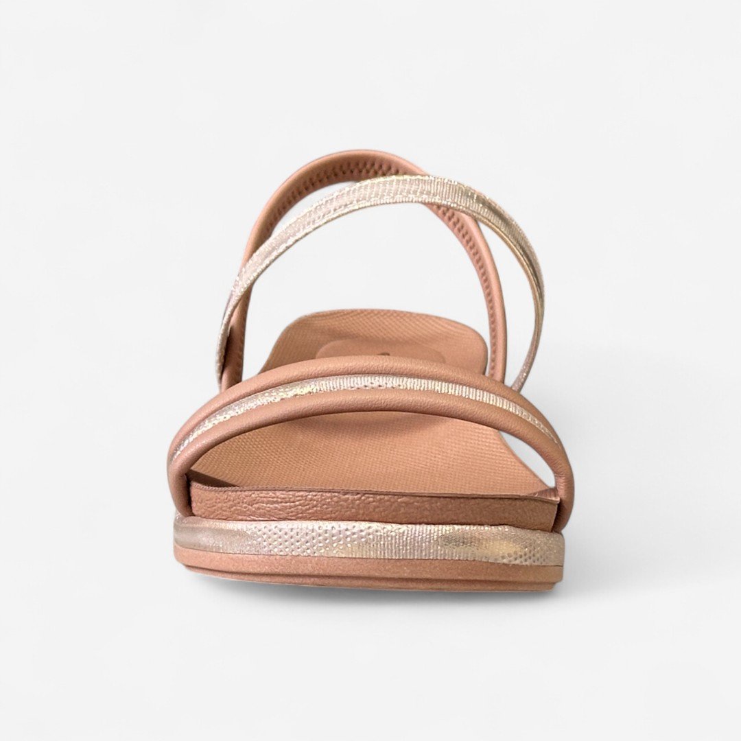 Rasteira flatform com detalhes metalizados que adicionam charme e sofisticação, combinando com diferentes estilos de roupas e ocasiões.