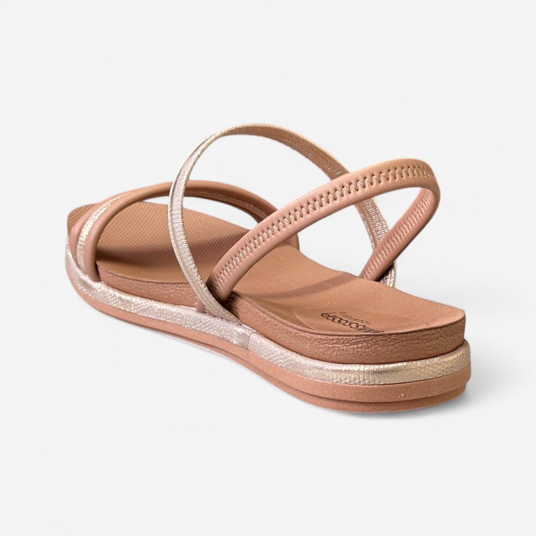 Calce fácil com elástico, facilitando a colocação e retirada da sandália. O design macio garante que os pés não sofram com o uso prolongado.