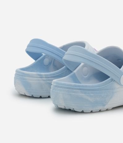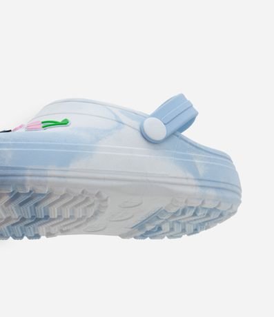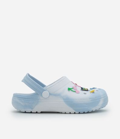 Ref: Sandália infantil de modelo babuche, com bico redondo, furinhos e tira de sustentação. Possui patchs no cabedal e estampa tie dye.