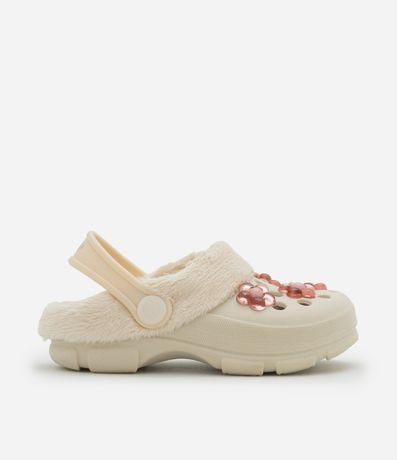 Ref: Sandália infantil tipo babuche confeccionada em PVC resistente, com interior totalmente forrado em pelinhos macios para maior conforto térmico. Possui bico fechado com furos para ventilação, tira traseira móvel para ajuste e aplicação decorativa de flores em relevo no cabedal, ideal para acompanhar os pequenos nos dias frios com conforto e estilo.