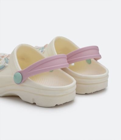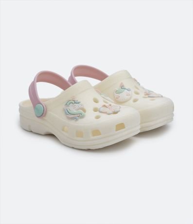 Sandália babuche infantil com bico redondo, tira contrastante e patches de unicórnio e borboletas.