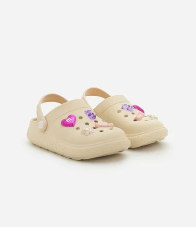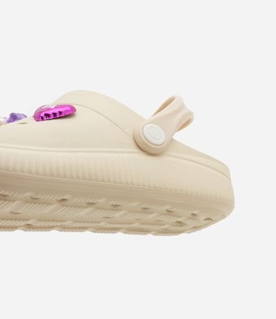 Ref: Sandália infantil confeccionada em PVC, no modelo babuche, possui bico redondo, alça de sustentação, furinhos e patchs aplicados.