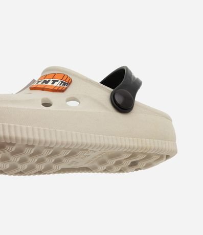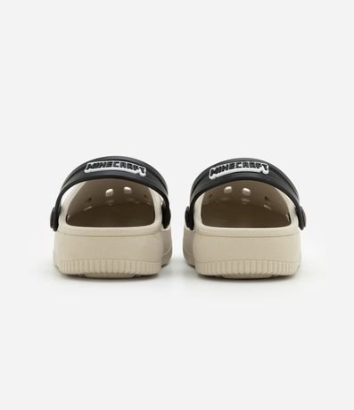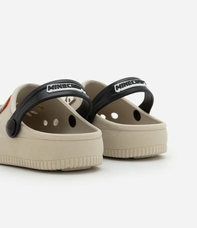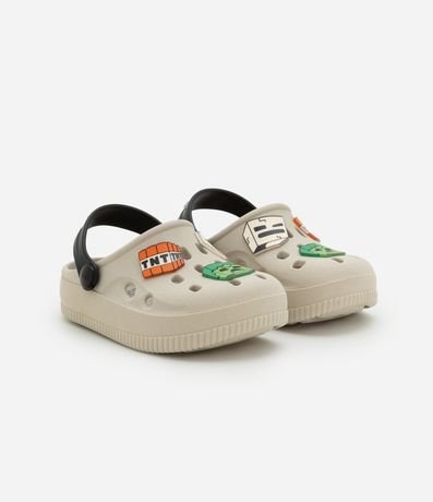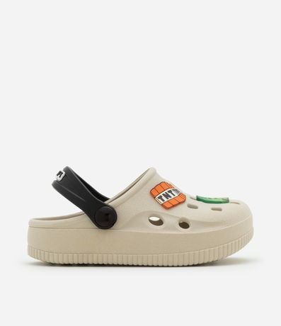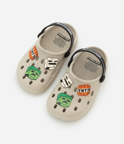 Sandália infantil confeccionada em PVC, no modelo babuche, possui bico redondo, furinhos, alça de sustentação e aplicação de patchs do Minecraft.