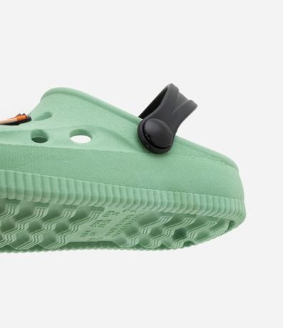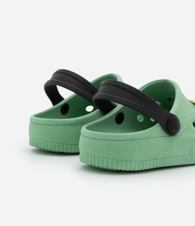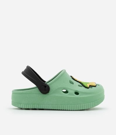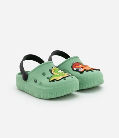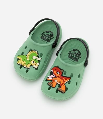 Ref: Sandália infantil confeccionada em PVC, no modelo babuche, possui bico redondo, com furos, alça de sustentação traseira e patchs do Jurassic Park.