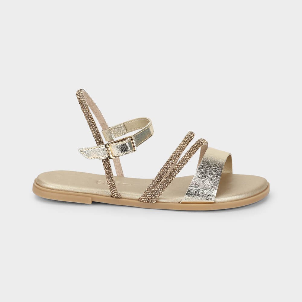 • Design elegante na cor dourada, complementado por tiras de strass, trazendo um toque de brilho e glamour.