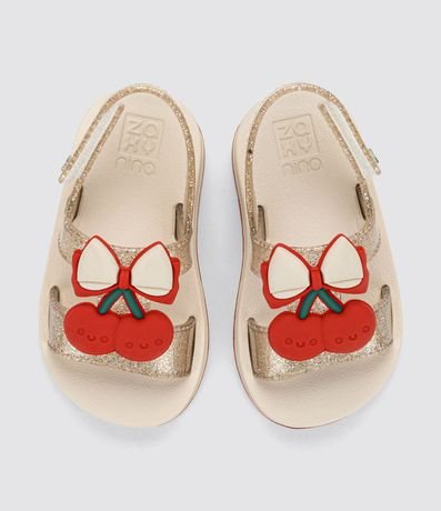 Ref: Sandália infantil, de solado flat, duas tiras e patch de cerejinhas aplicado. Possui fechamento com velcro.