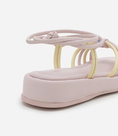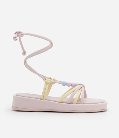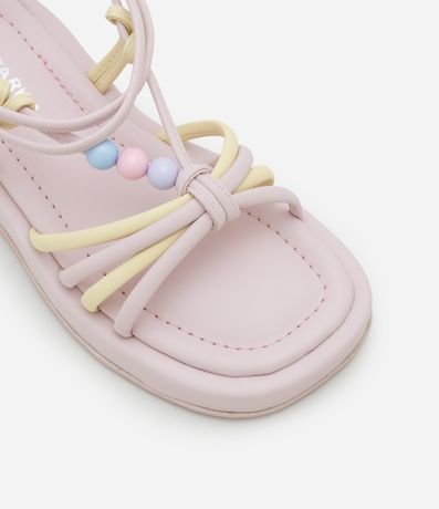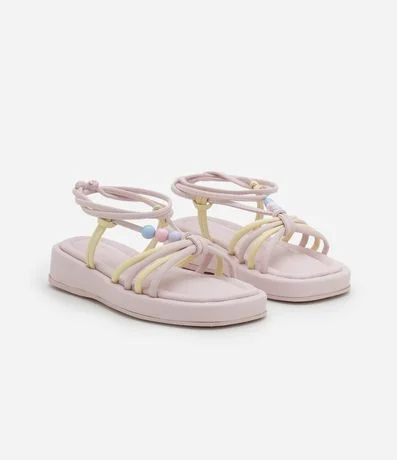 Ref: Sandália infantil confeccionada em material sintético, multi-tiras com aplicação de miçangas e amarração na perna.