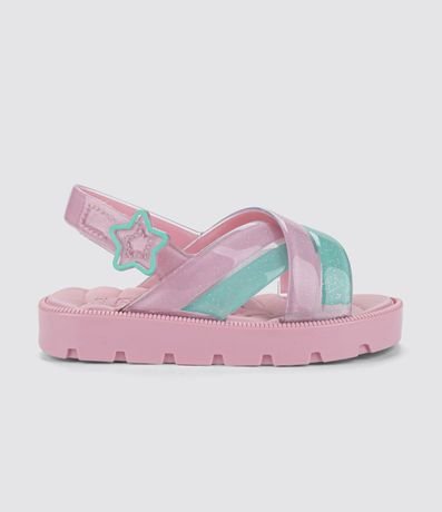 Sandália infantil, de solado flat, tiras em X e brilhinhos. Possui fechamento com velcro.