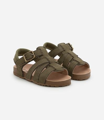 Ref: Sandália infantil confeccionada em material sintético, com fechamento por fivela, tiras trançadas e bico redondo.