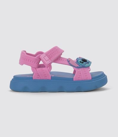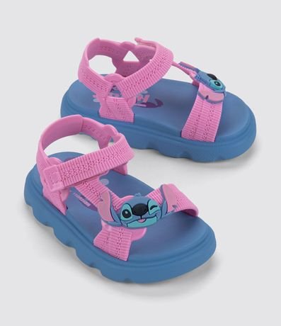Sandália infantil confeccionada em pvc, com bico redondo, modelo de tiras, com patch do Stitch e fechamento por velcro.
