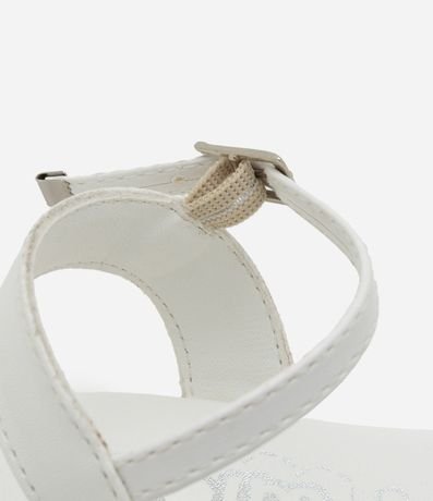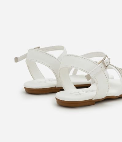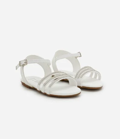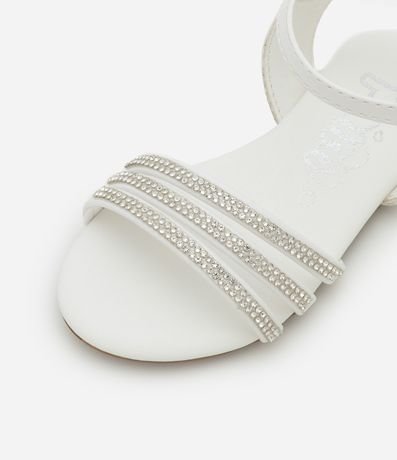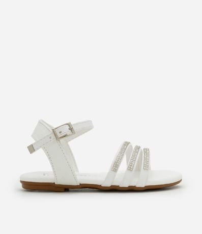 Ref: Sandália infantil em material sintético com fechamento no tornozelo por fivela, várias tiras com detalhe de strass e bico redondo.