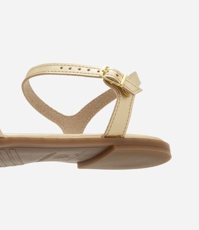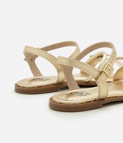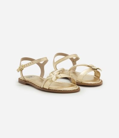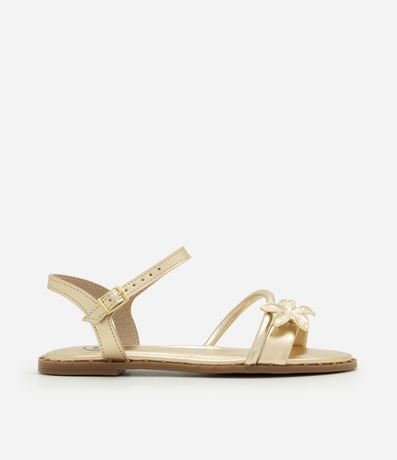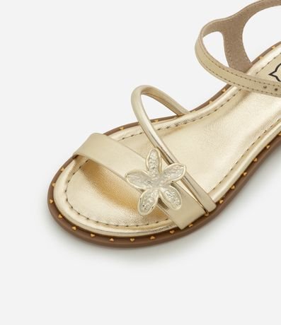 Ref: Sandália infantil confeccionada em material sintético, no modelo de tiras, possui bico redondo, fechamento por fivelas, tachinhas na sola e aplicação de flor nas tiras.