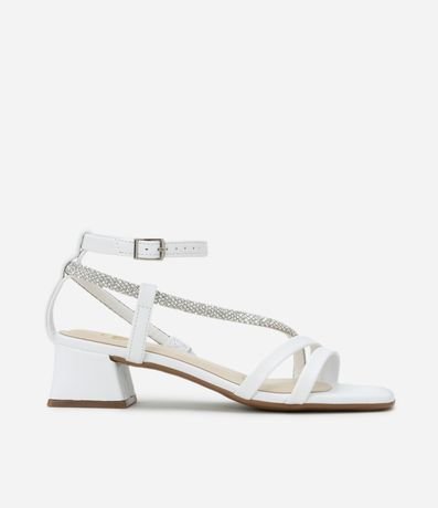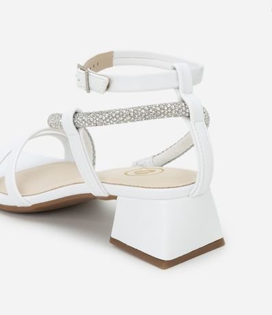 Sandália infantil com bico quadrado, fechamento por fivela, tiras no cabedal, sendo 01 coberta por brilhos. Possui salto médio.