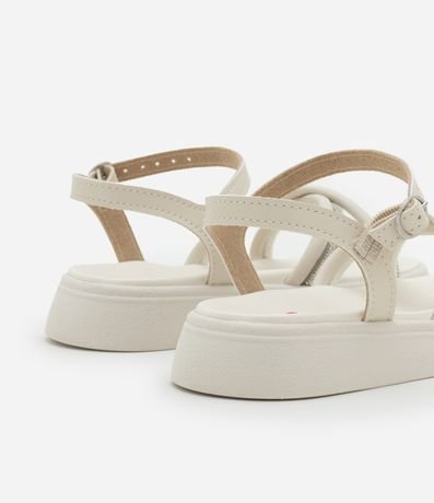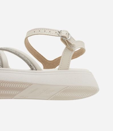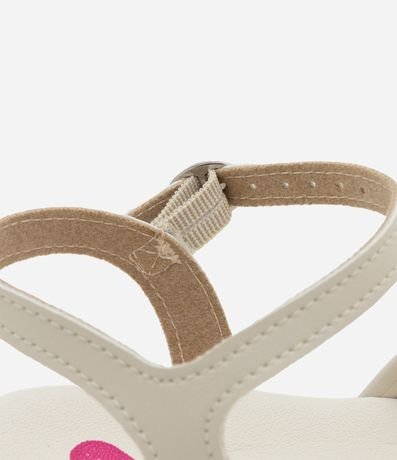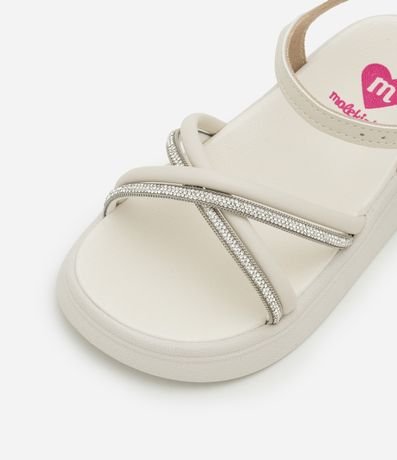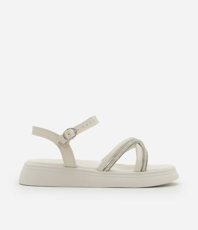 Ref: Sandália infantil confeccionada em material sintético, no modelo flatform, possui bico redondo, fechamento por fivelas e aplicação de strass.