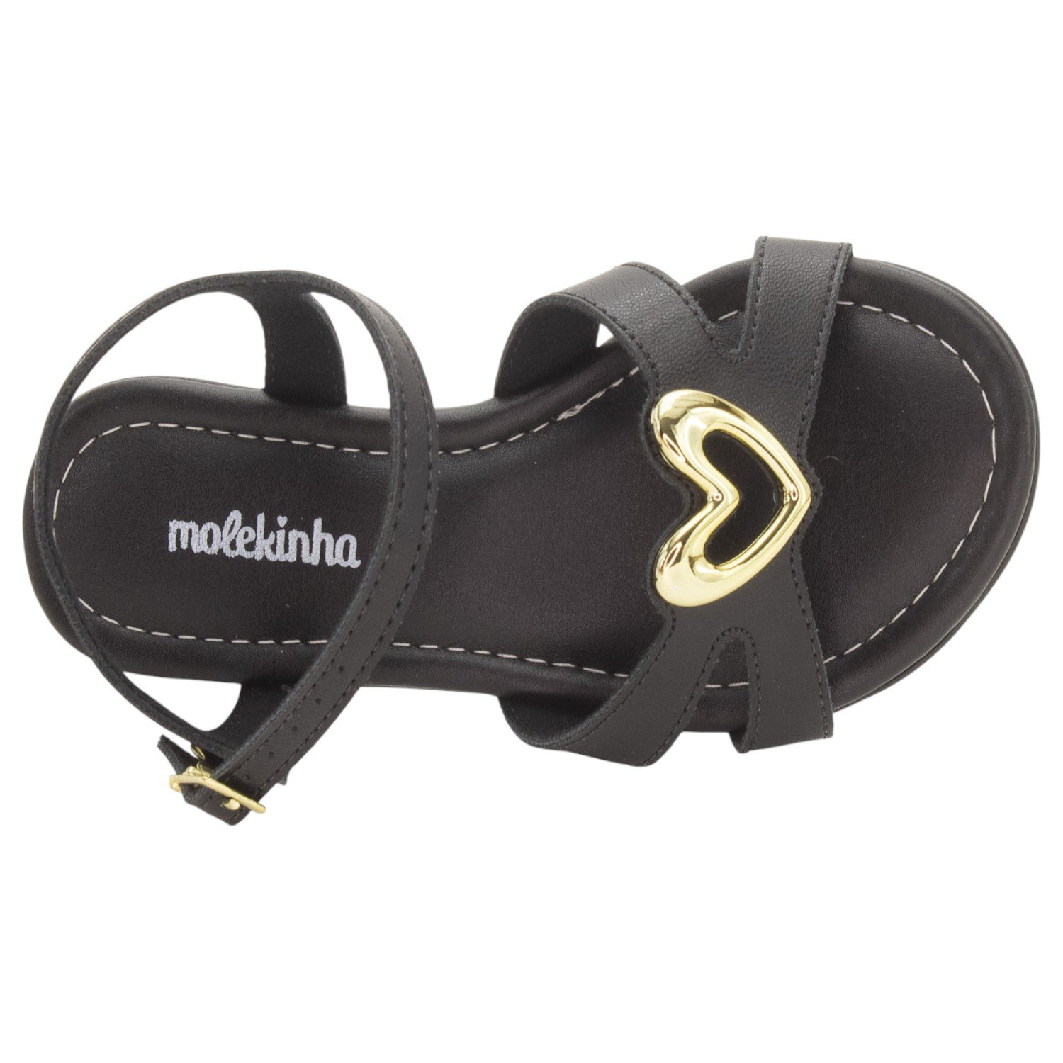 Ref: A Sandália Menina Molekinha Coração 2318.148 é a escolha perfeita para quem busca unir conforto, delicadeza e estilo em um único calçado. O modelo possui um design clássico de sandália com tiras, ideal para festas, passeios e momentos especiais. O destaque fica por conta da aplicação dourada em formato de coração sobre a tira principal do cabedal, adicionando um toque de charme e elegância. O acabamento na cor Preta é fosco/texturizado, e os pespontos em linha branca contrastante realçam as costuras, conferindo um visual sofisticado. O salto baixo blocado de aproximadamente 2 cm oferece segurança e estabilidade, permitindo que as pequenas aproveitem cada passo com liberdade. A sandália garante durabilidade, enquanto a palmilha macia proporciona conforto prolongado, absorvendo impactos. O fechamento por fivela ajustável no tornozelo garante um encaixe perfeito e seguro. Com seu design atemporal e toque dourado, esta sandália é perfeita para compor tanto looks casuais quanto os mais arrumados, encantando mães e filhas com a qualidade e o charme característicos da marca Molekinha.