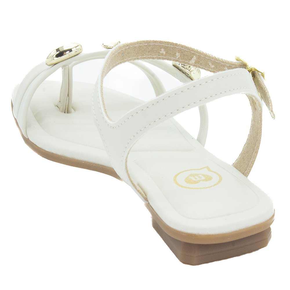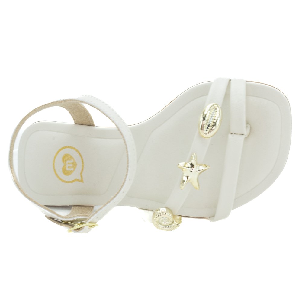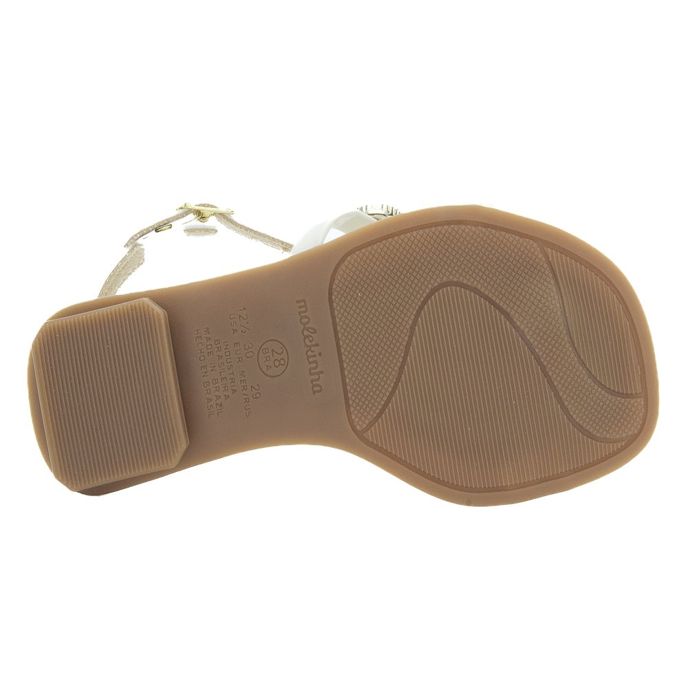 Ref: A Sandália Rasteira Infantil Molekinha (Modelo: 2354.127) é a escolha perfeita para as meninas que querem trazer um toque de delicadeza e charme de Primavera/Verão aos seus looks. Confeccionada em material sintético de alta qualidade na cor branca atemporal, esta sandália oferece leveza e conforto para o dia a dia. O grande destaque fica por conta do design do cabedal, que combina o estilo rasteira com um separador de dedos (estilo toe strap) e tiras finas cruzadas, adornadas com apliques metalizados dourados com tema marinho. Os apliques incluem uma charmosa concha com brilhos e uma estrela-do-mar, adicionando um toque lúdico e sofisticado. Pensando no conforto e segurança, a sandália possui um solado sintético na cor caramelo, que é antiderrapante e possui um salto baixo quadrado para maior estabilidade. O fechamento é feito por fivela lateral ajustável na cor dourada, garantindo um ajuste seguro e prático no tornozelo. Ideal para passeios casuais e momentos de lazer, esta sandália Molekinha combina beleza, conforto e um visual delicado e fashion para as pequenas.