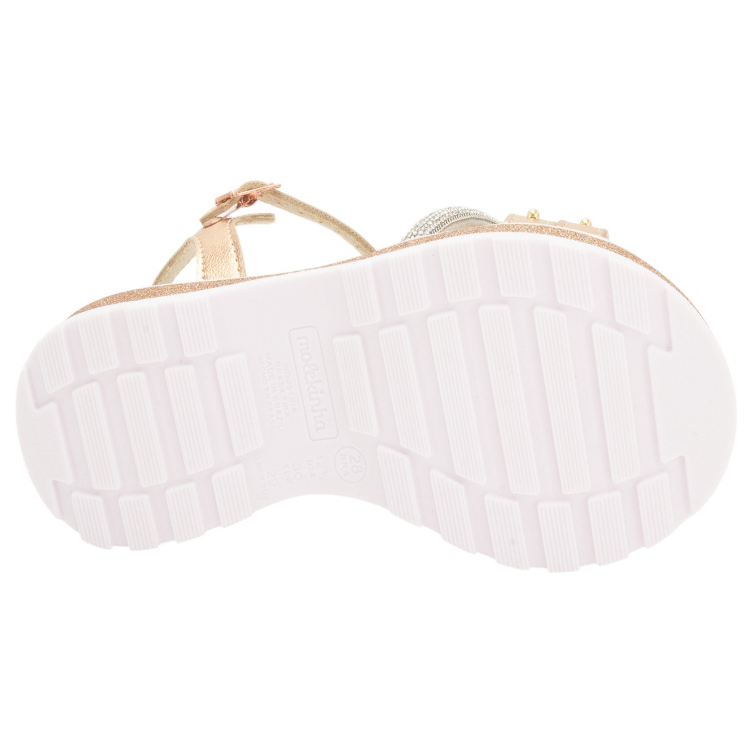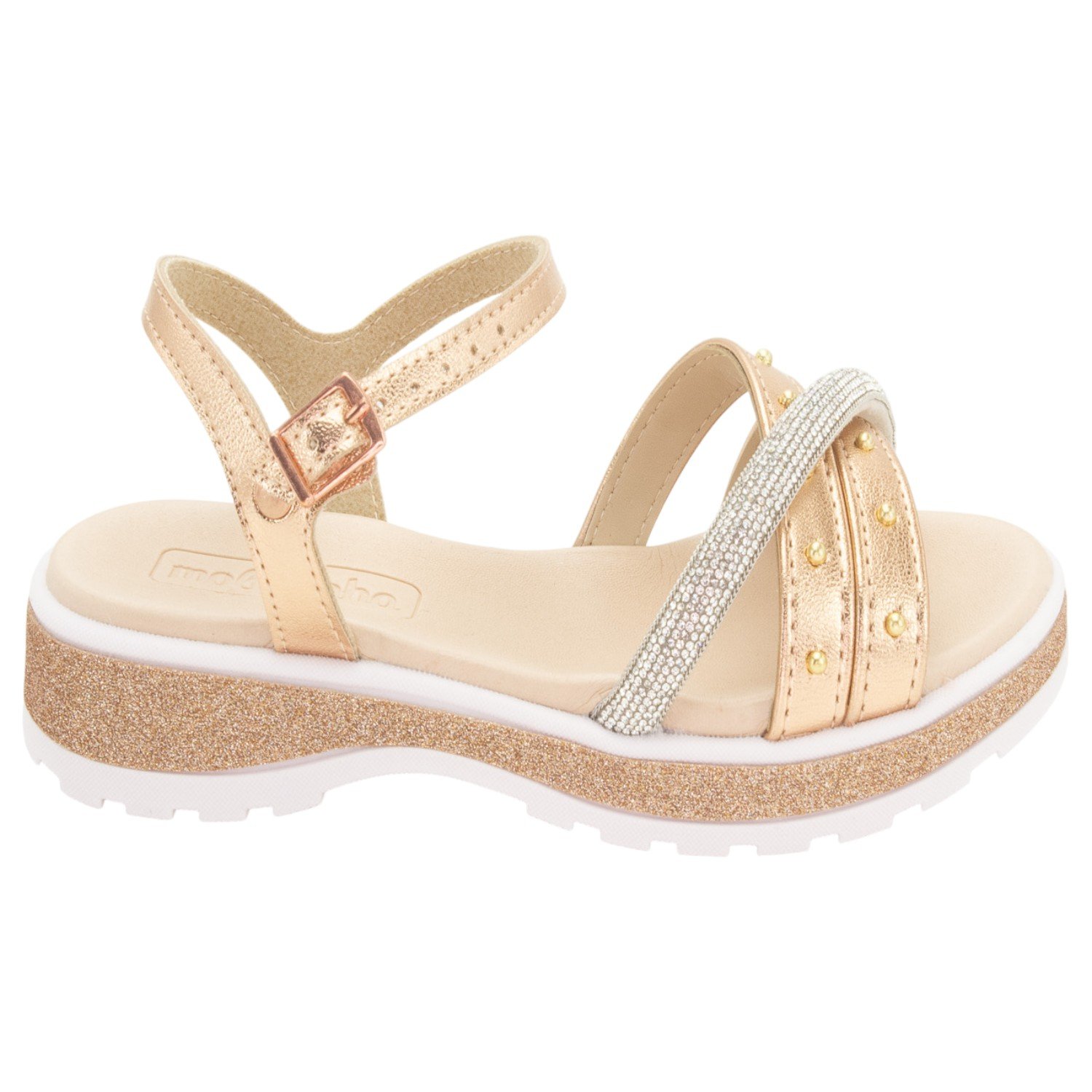 Ref: A Sandália Infantil Molekinha é a combinação perfeita de brilho, estilo e conforto para acompanhar as meninas em todas as ocasiões, apresentando um design moderno na cor Ouro Rosado com tiras delicadas em acabamento metalizado, sendo uma adornada com apliques dourados e a outra com detalhes em strass, conferindo um visual sofisticado e glamouroso. O conforto é garantido pela palmilha macia e o solado leve, que possui um charmoso acabamento em glitter na entressola e é tratorado e antiderrapante, oferecendo segurança e firmeza a cada passo, enquanto o fechamento por fivela ajustável no tornozelo proporciona um encaixe perfeito e prático para o dia a dia agitado; versátil e cheia de personalidade, esta sandália é ideal para festas, passeios e momentos especiais, adicionando um toque luxuoso e contemporâneo a qualquer look infantil.