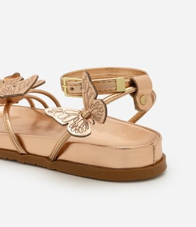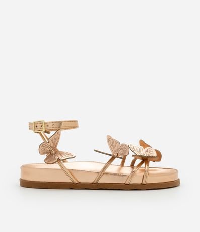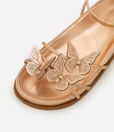 Ref: Sandália infantil metalizada, com tiras finas e aplicação de borboletas, fechamento por fivela no tornozelo, bico redondo e solado reto baixo.